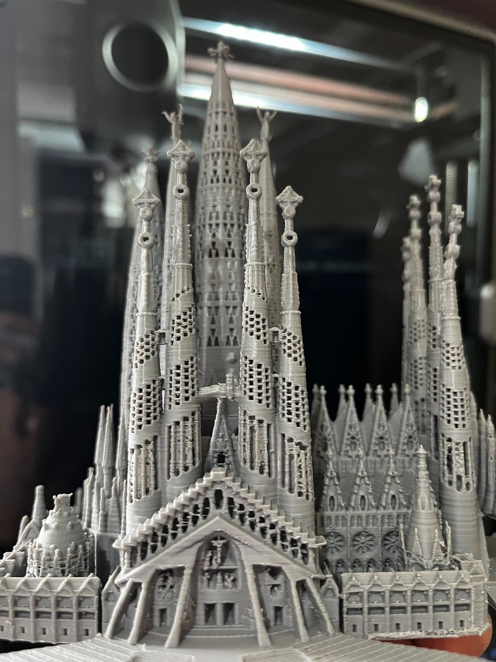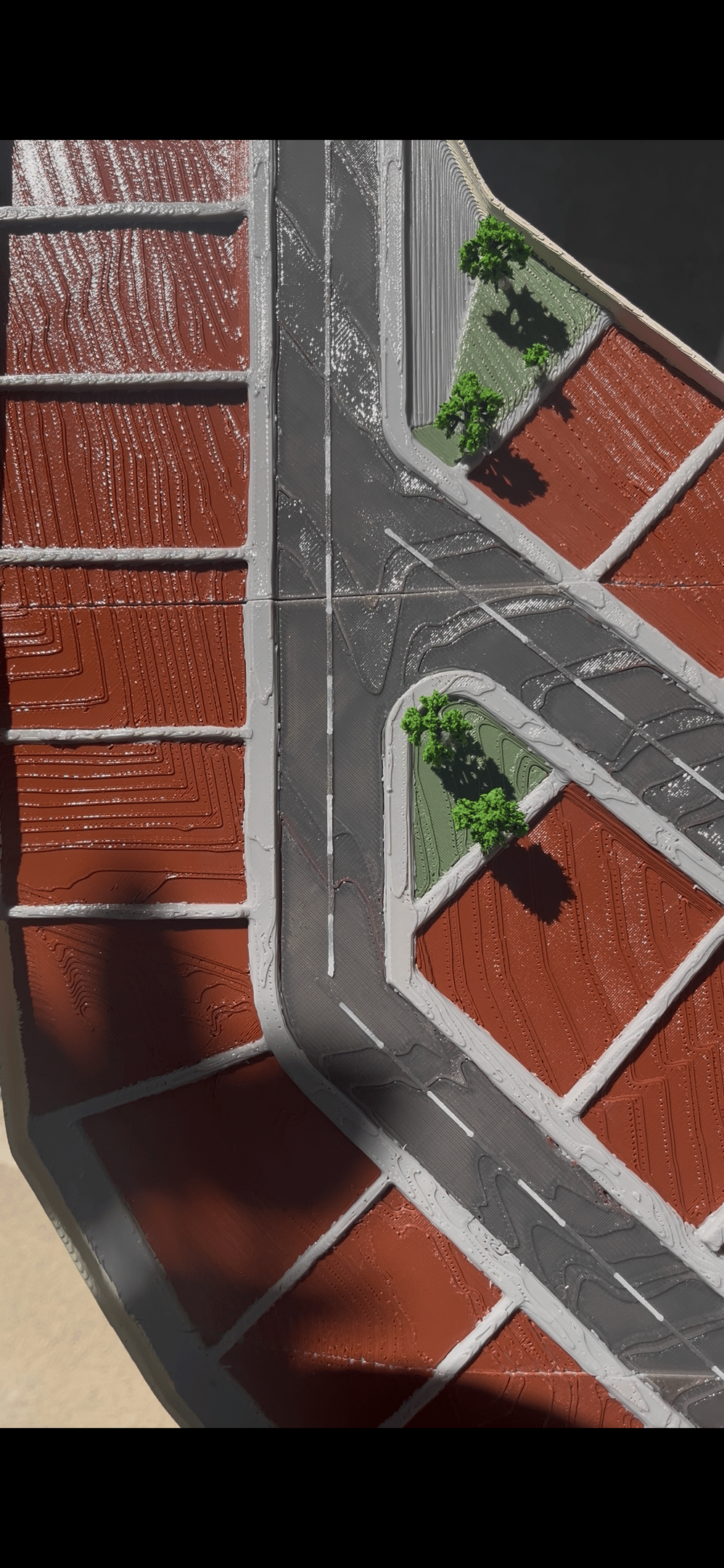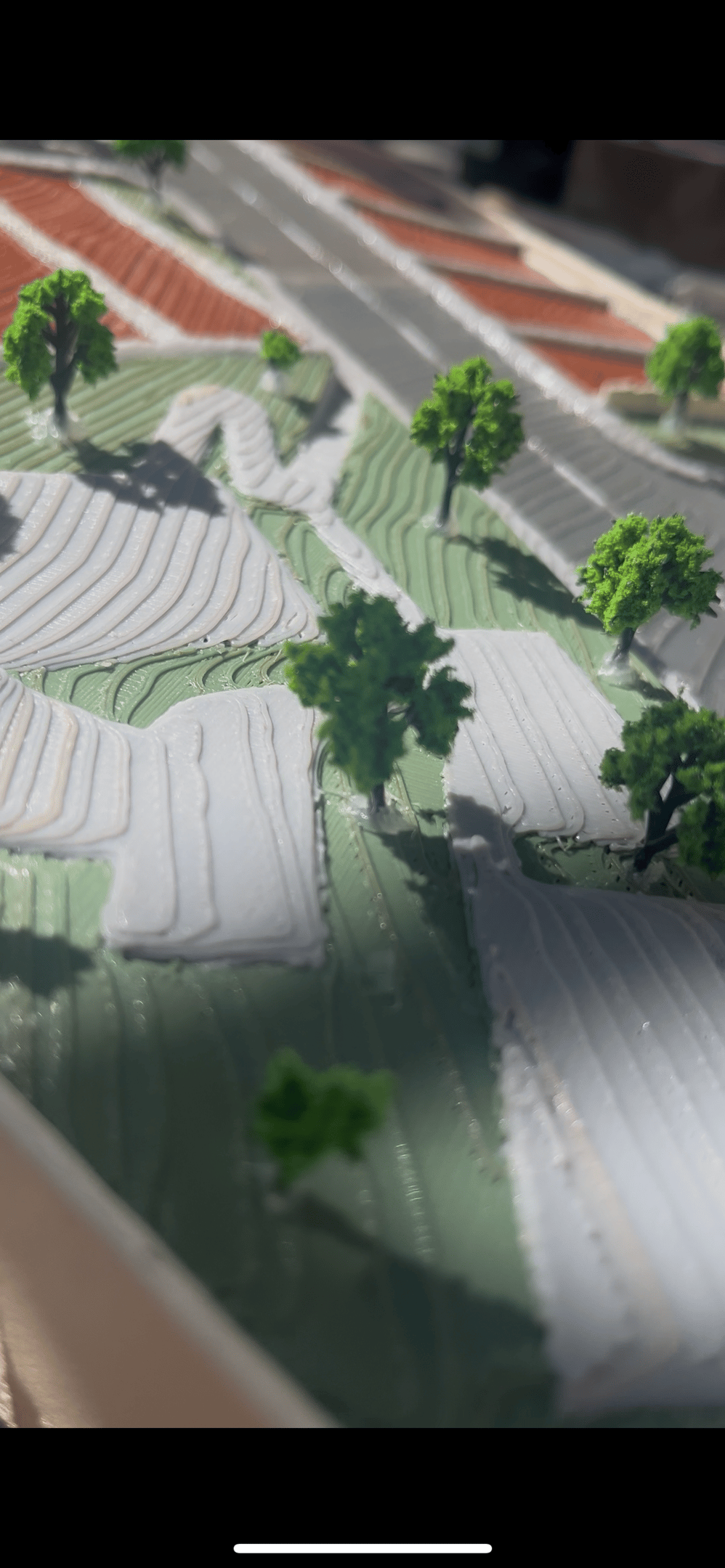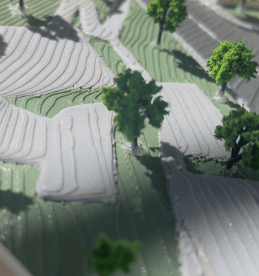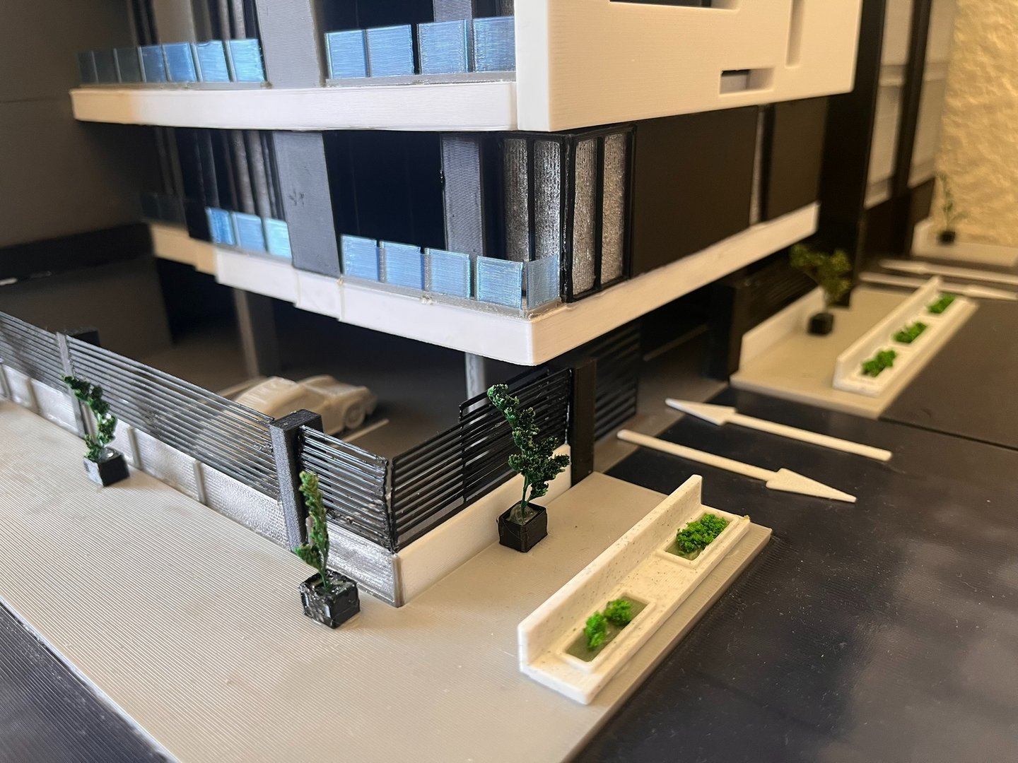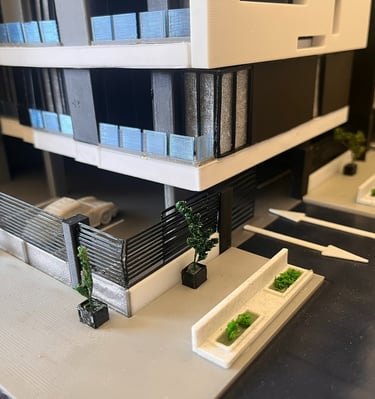 Close-up of a sleek architectural model with glowing cyan IoT sensors embedded.